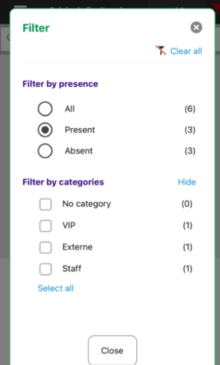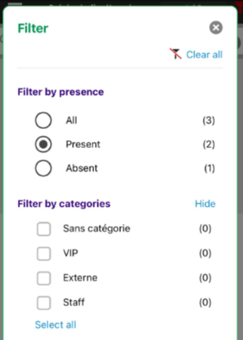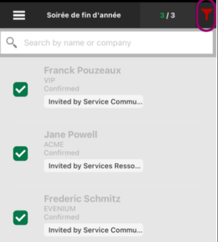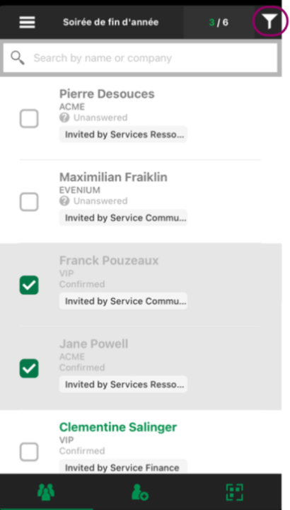 Do you need to know directly from your OnSite application how many VIPs have not yet arrived, and exactly who they are? With just one click, you can filter your guests by category and/or by whether they have already been scanned as present and by whom they have been invited (if the “Collaborative management” module has been activated on your event).
