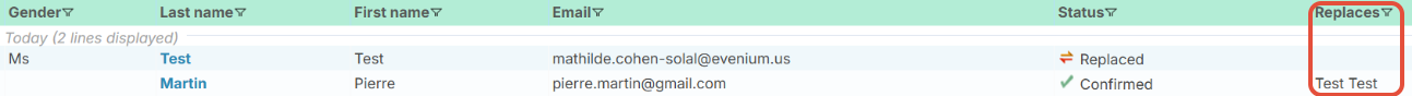 In addition, there is a column that allows you to display the name of the original guest next to the replacement: It is called Replaces [First and Last Name].