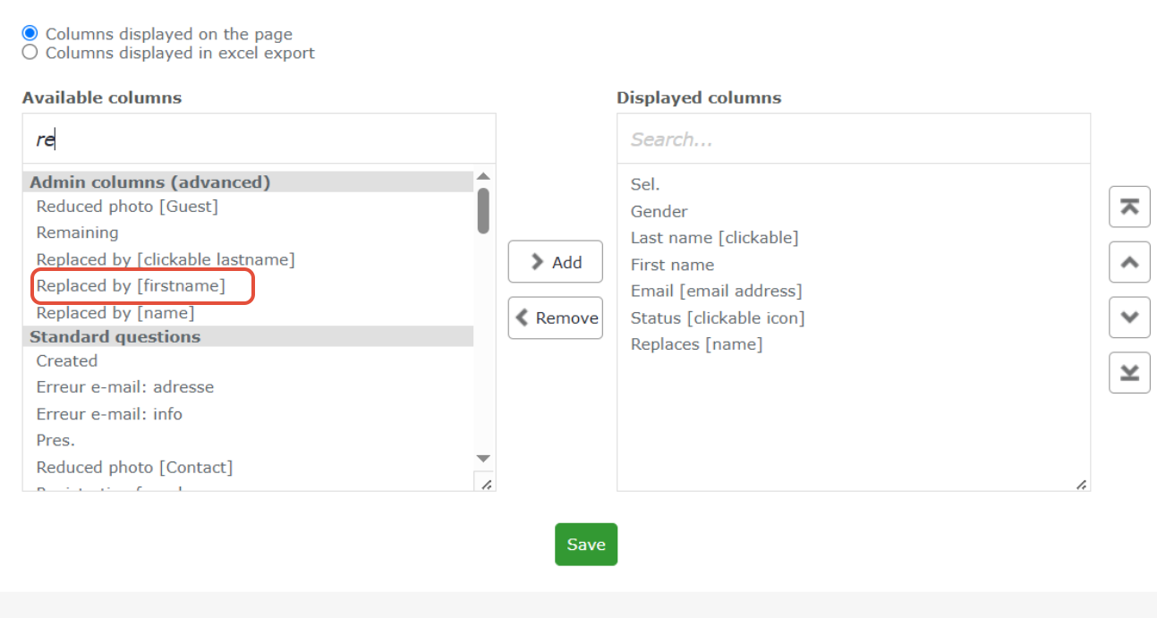 A window like this will open. Select “Replace [First and Last Name]” from the “Available Columns” and add it to the “Displayed Columns.” This will allow this field to appear in the “Guests” tab, next to columns such as First Name, Last Name, Status, etc.