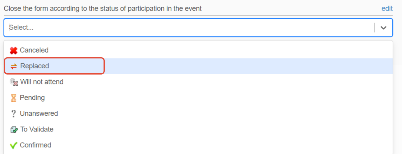 Click on “Edit,” select “Replaced,” and save your changes so that the registration form is closed for this status.