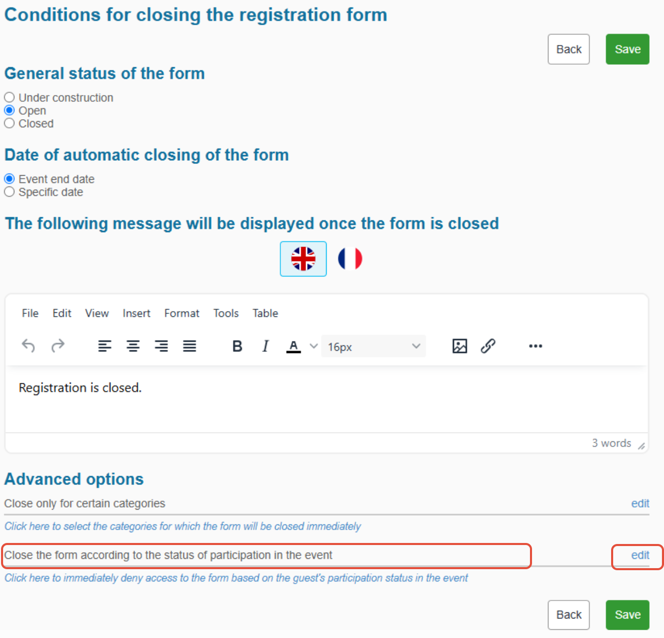 To do this, go to “Advanced Options” at the bottom of the page, in the section “Close the form based on event participation status.”