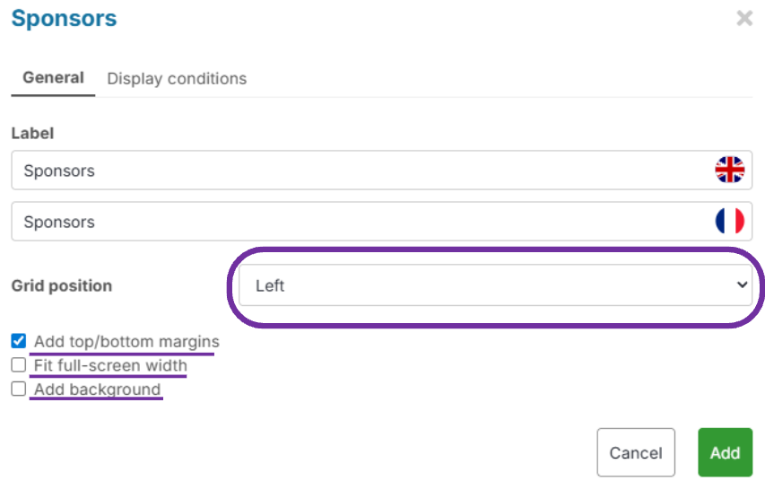 • Choose whether to add top and bottom margins, make the block full-width, and add a background
