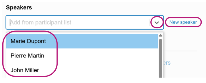 Select them from the dropdown list or create a new speaker by clicking on "New Speaker" The order of selection will be automatically saved.