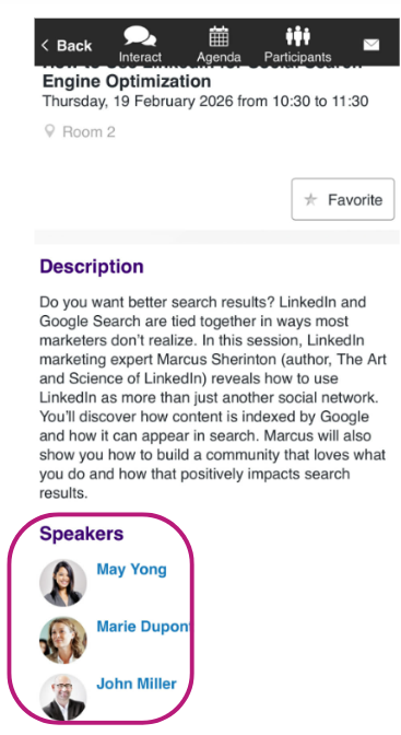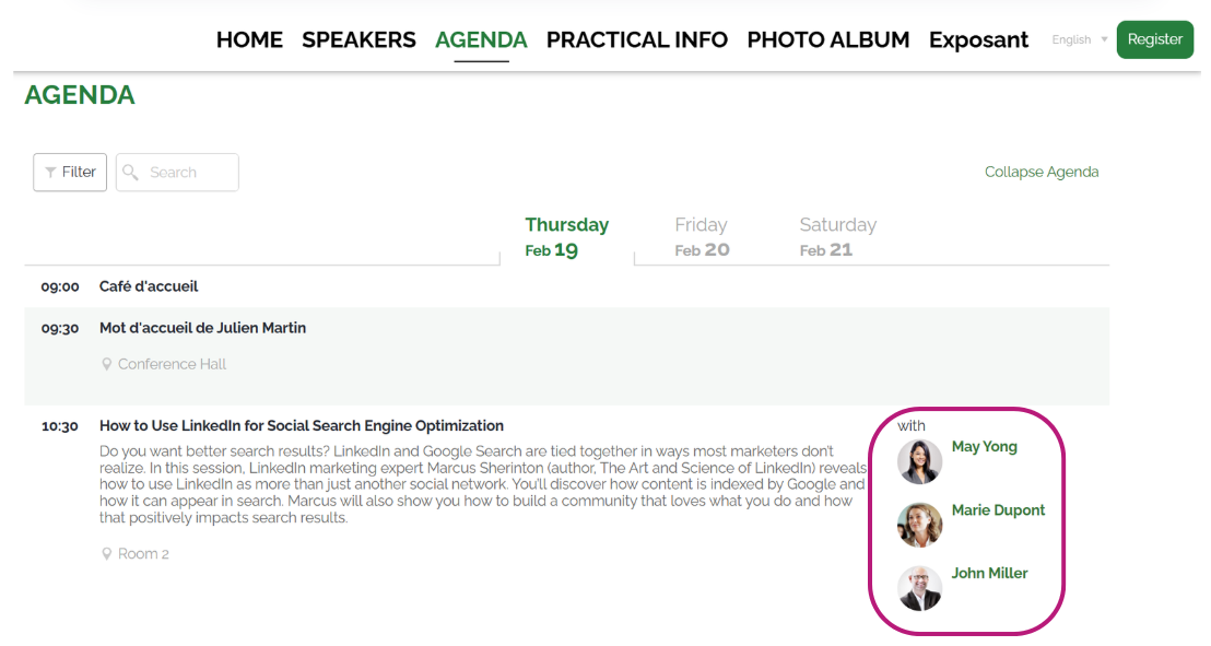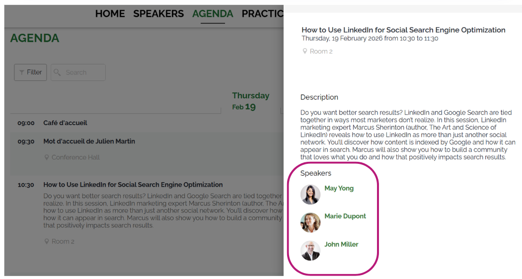 By defining the order of speakers in your program, you ensure a coherent organization that aligns with the content of each session, while highlighting key speakers. This ensures a smooth and optimized experience for participants, whether on the ConnexMe app or your website.