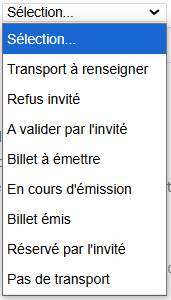 Plusieurs statuts de transport sont disponibles dans la fiche de l’invité et sont sélectionnables grâce à un menu déroulant.