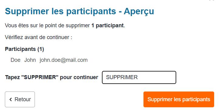 Pour valider la suppression de votre participant, vous devez écrire SUPPRIMER dans la zone de texte dédié.