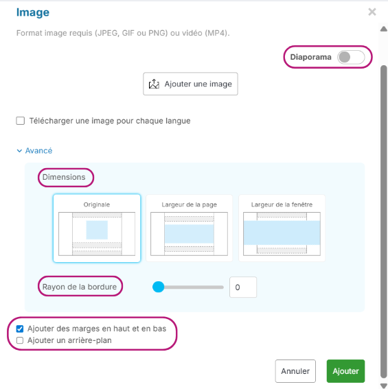 Vous pourrez également modifier le Rayon de la bordure afin que les bords de l'image soient arrondis si souhaité.