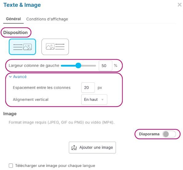 - Choisissez la disposition de votre texte et de votre image ainsi que la largeur de la colonne gauche