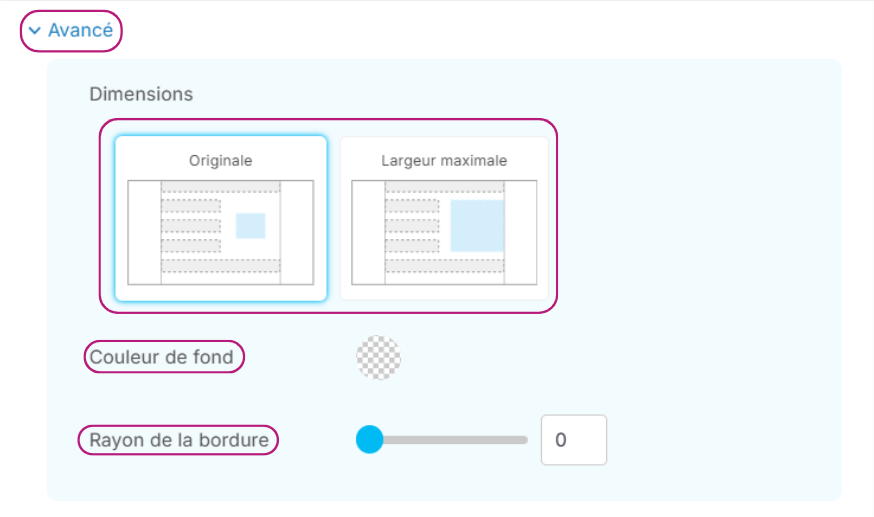 - Dans Avancé choisissez si vous préférez garder les dimensions de votre image d'origine ou bien si vous souhaitez lui attribuer la largeur maximale