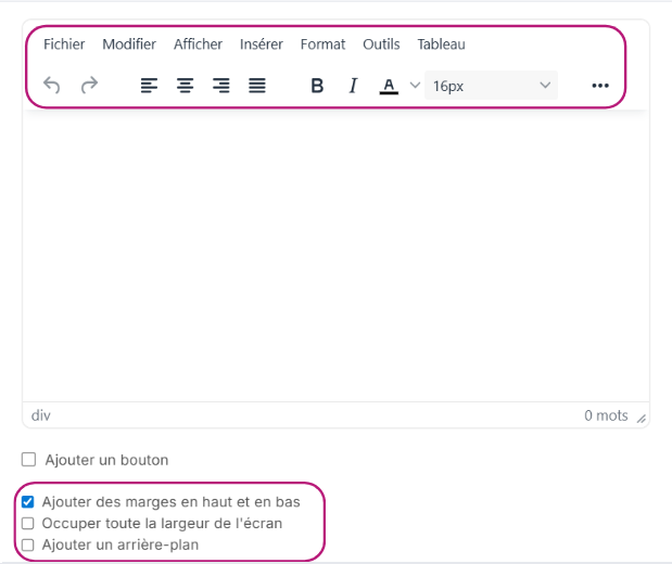 - Choisissez d’ajouter un arrière-plan à la cellule, déterminez si elle doit occuper toute la largeur de l'écran ou bien ajoutez des marges en haut en en bas de cette dernière si souhaité