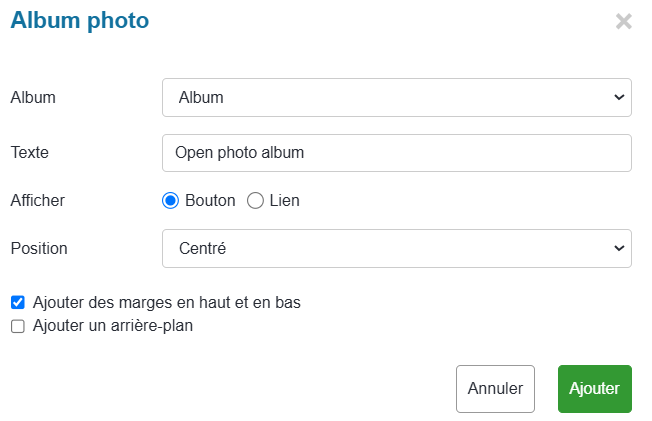 - Puis choisissez comment vous souhaitez que l'accès à l'album s'affiche (Bouton ou Lien)