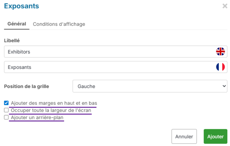 Choisissez si vous souhaitez ajouter des marges en haut et en bas, qu'il occupe toute la largeur de l'écran et ajouter un arrière-plan