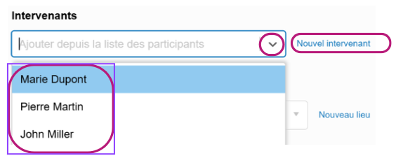 Sélectionnez-les depuis la liste déroulante ou créez un nouvel intervenant en cliquant sur ‘Nouvel intervenant’. L’ordre de sélection sera automatiquement conservé.