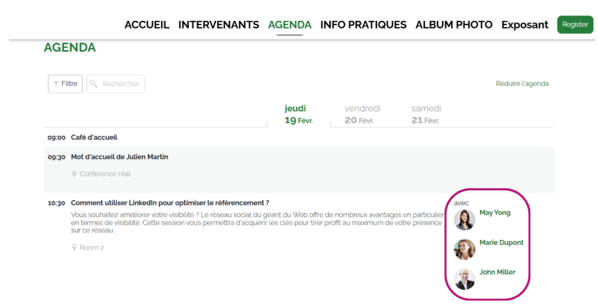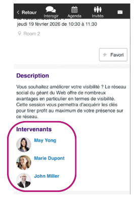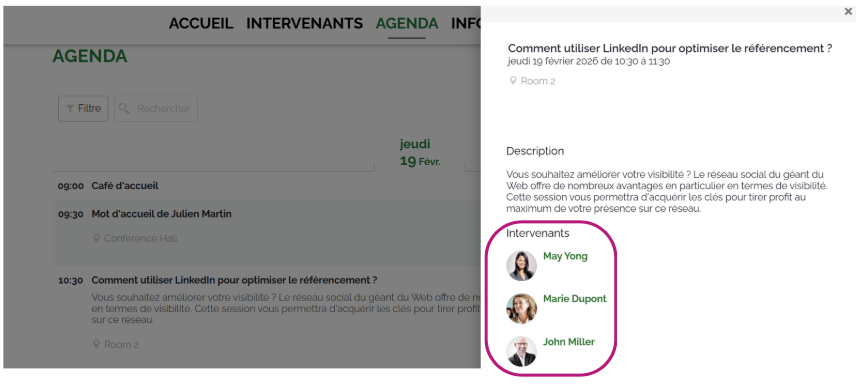 En définissant l’ordre des intervenants dans votre programme, vous garantissez une organisation cohérente avec le contenu de chaque session, tout en mettant en avant les intervenants clés. Cela assure une expérience fluide et optimisée pour les participants, que ce soit sur l’application ConnexMe ou sur votre site internet.