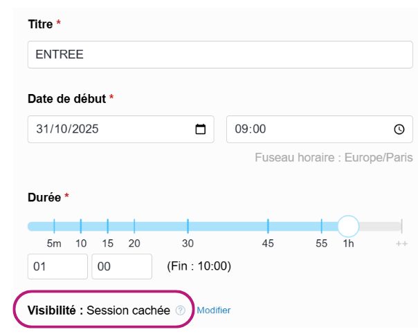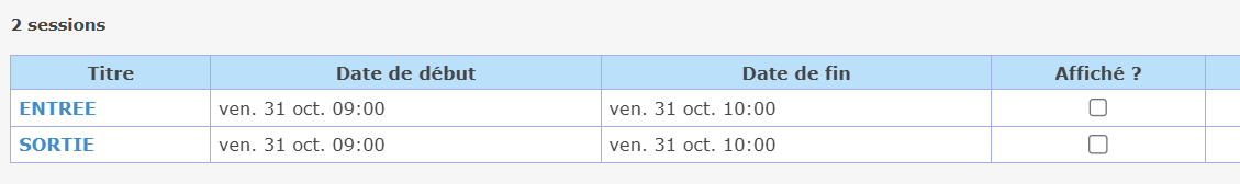 Pour suivre l'entrée et la sortie de vos participants, commencez par créer deux sessions distinctes : “Entrée” et “Sortie”.
