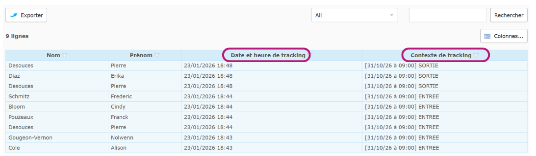 Les colonnes “Date et heure de tracking” et “Contexte de tracking” vous indiqueront respectivement :