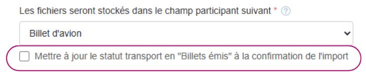 Vous pouvez activer l’option pour mettre à jour automatiquement le statut transport des participants en “Billet Émis” dès que les billets sont chargés.