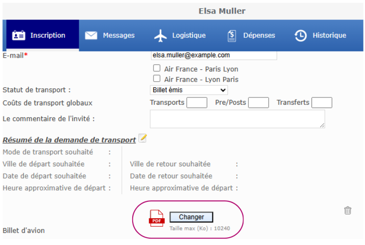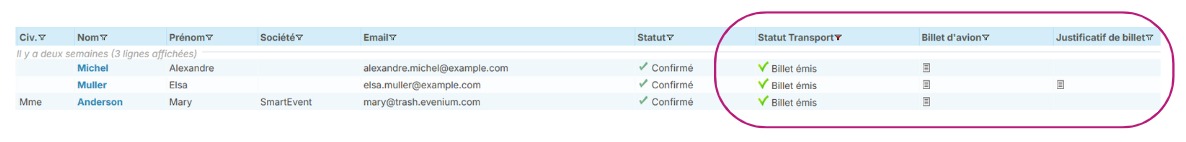 En cliquant sur le nom, vous accédez au récapitulatif complet des informations de transport du participant :