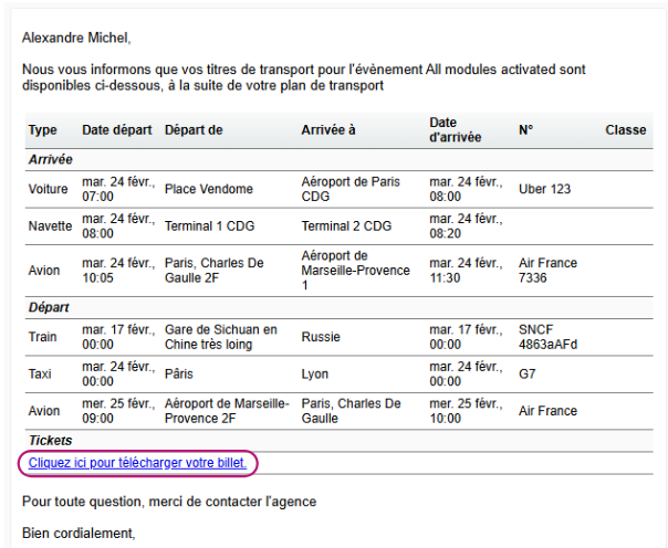 Vous pouvez sélectionner vos participants et leur envoyer l’email “Transport - Billets envoyés”, dans lequel les documents importés sont téléchargeables